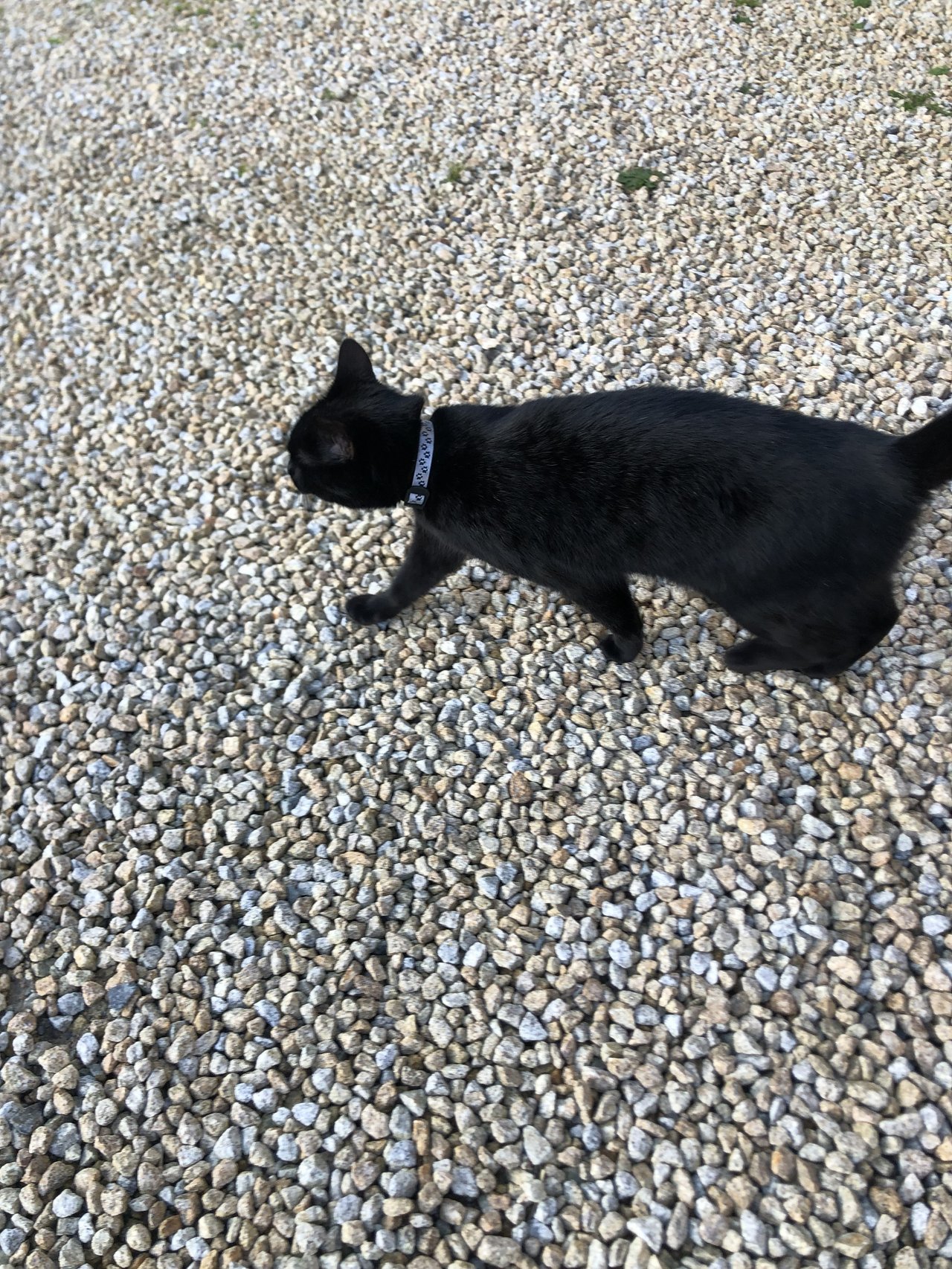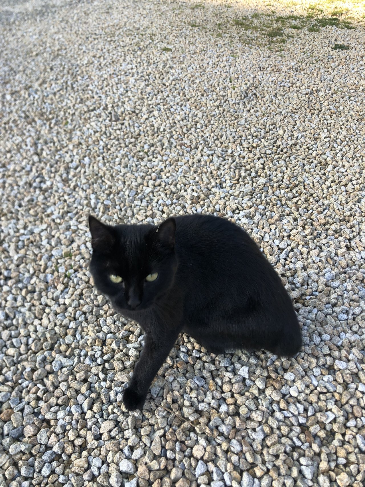Un joli petit chat noir se promène dans le bourg à la recherche de nourriture.