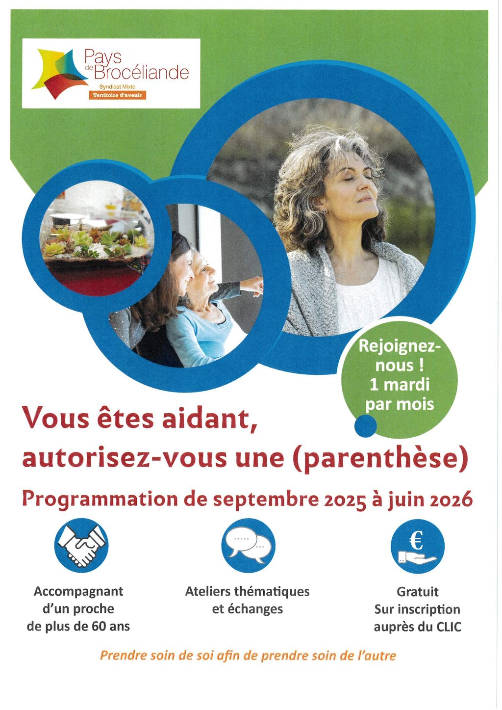 Programme des ateliers de répit et de soutien aux aidants proposé par le CLIC du Syndicat mixte du Pays de Brocéliande, en partenariat avec la médiathèque de Landujan. Des professionnels qualifiés animent des séances tournées vers le bien-être : une parenthèse dans son quotidien d’aidant, un temps pour soi, pour souffler et se ressourcer.