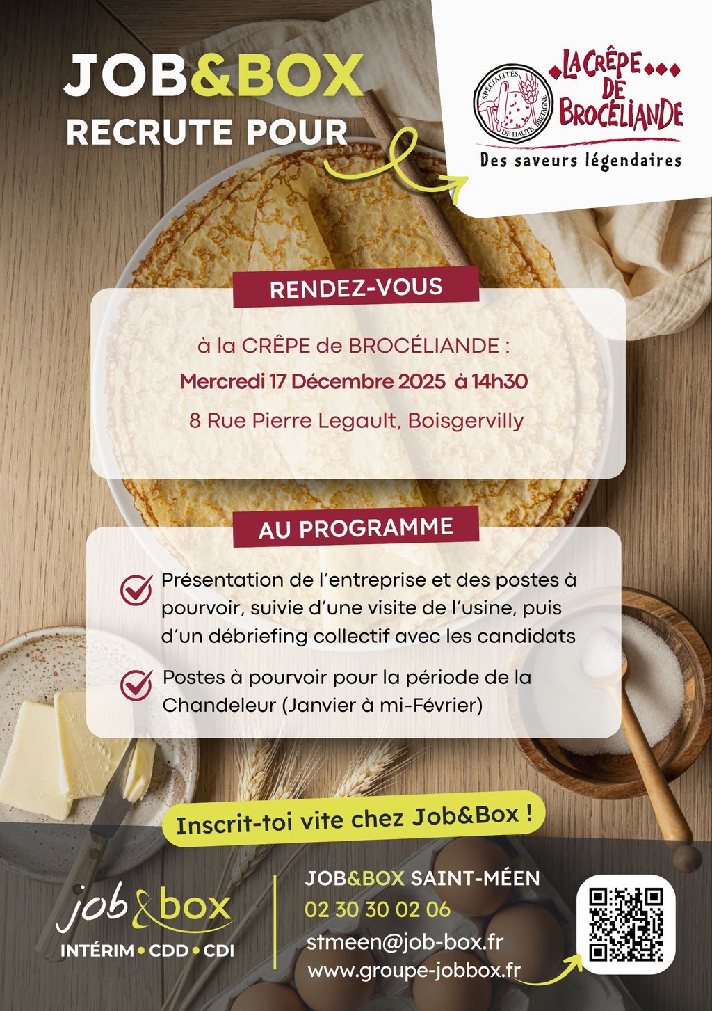 Nous organisons une session collective de recrutement le mercredi 17 décembre à 14h30 au sein de la Crêpe de Brocéliande pour la chandeleur.