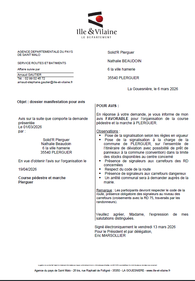 L'association Solid'R Plerguer organisera la 5e édition de la course solidaire des 2 étangs à Plerguer le dimanche 19 avril 2026, à partir de 9H30.